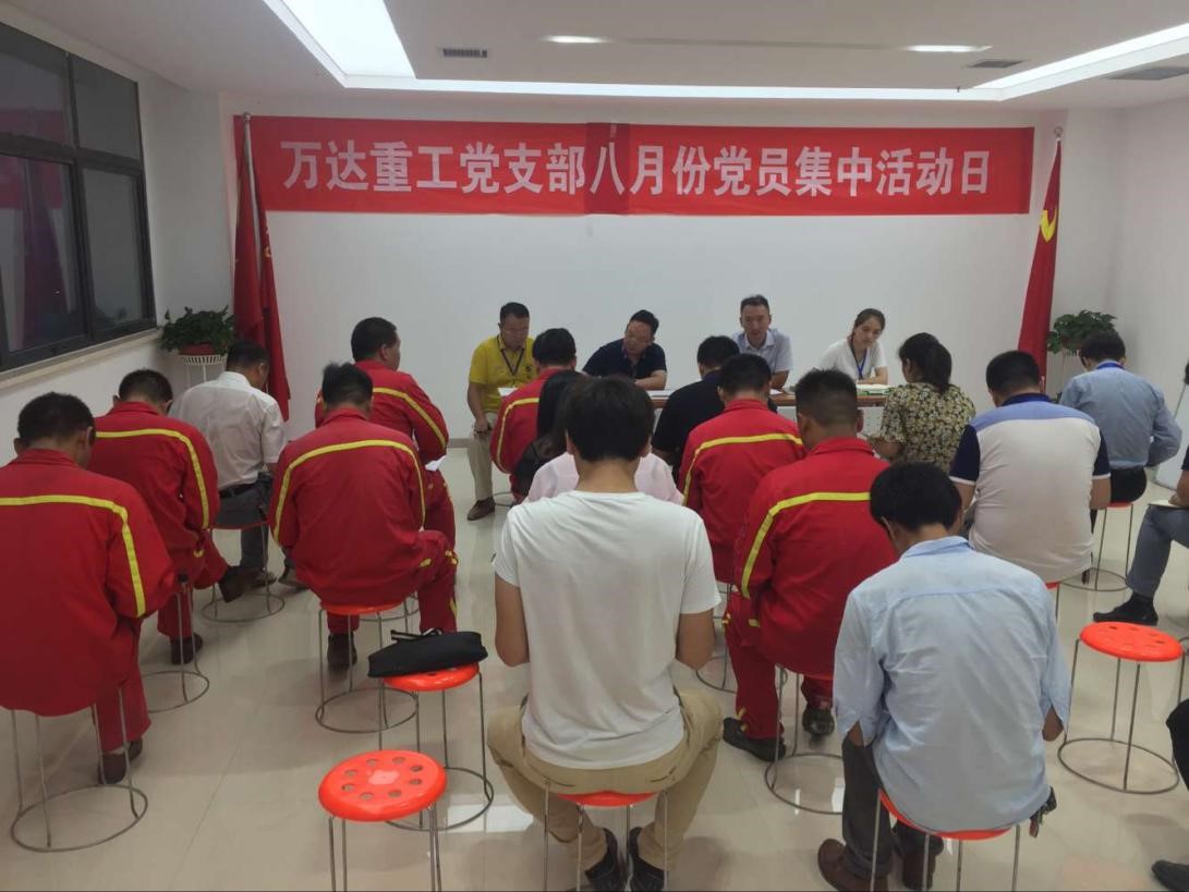 志愿活動結(jié)束后,黨員同志們在六樓會議室以《非公企業(yè)基層黨組織建設(shè)標(biāo)準(zhǔn)》為主要學(xué)習(xí)內(nèi)容,完成了八月份黨員集中日學(xué)習(xí)活動。這次學(xué)習(xí),首先由宣傳委員對《非公企業(yè)基層黨組織建設(shè)標(biāo)準(zhǔn)》進行宣讀。然后各黨小組進行了學(xué)習(xí)匯報和意見分享(各黨小組已于會前進行了討論學(xué)習(xí)),并針對萬達重工黨支部黨建活動中存在的不足提出了改進意見,促進萬達重工黨支部標(biāo)準(zhǔn)化發(fā)展。接著由黨關(guān)系未轉(zhuǎn)入黨員對未轉(zhuǎn)入情況做了說明,并分別就轉(zhuǎn)入期限做了計劃說明,為早日成立萬達重工黨總支打下了基礎(chǔ)。