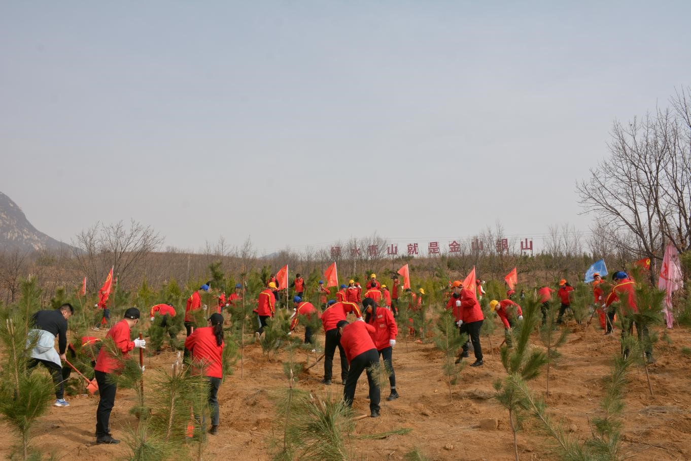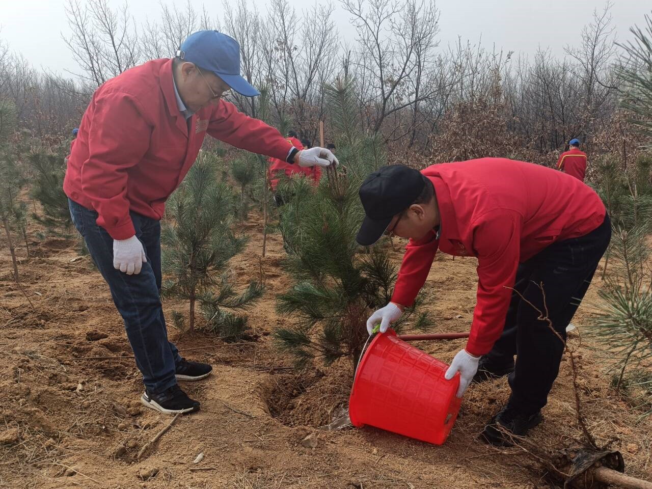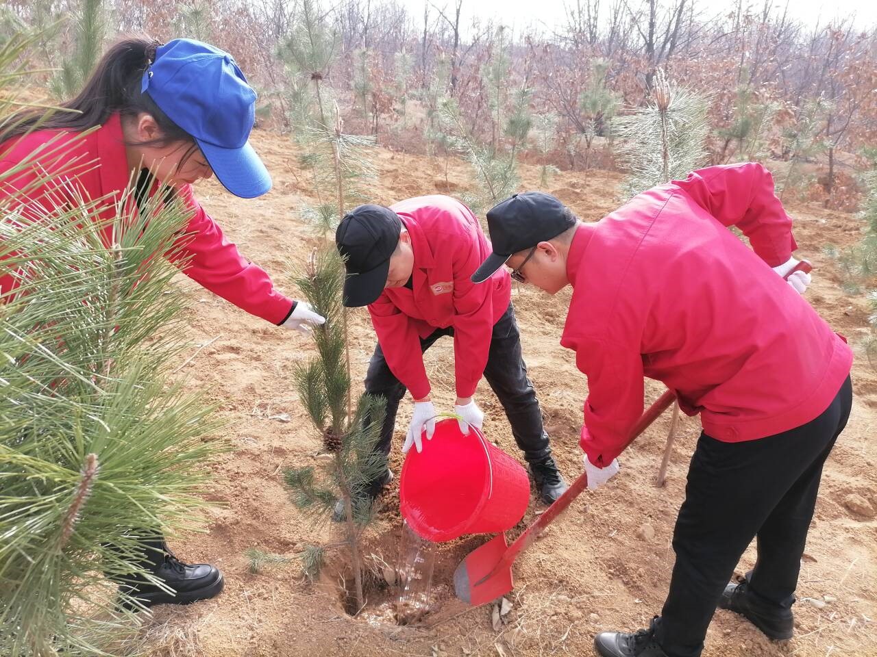 一桶清水,灌溉希望,一棵樹苗,承載未來。植樹現(xiàn)場黨旗、司旗、黨小組旗、團旗在風中迎風飄揚,植樹活動中,大家熱情高漲、干勁十足,全體參加人員發(fā)揚不怕苦、不怕臟、不怕累的精神,分工協(xié)作、揮鍬鏟土、扶樹填坑、踏土夯苗、提水澆灌,有條不紊地完成植樹各個環(huán)節(jié)。經(jīng)過大家一上午的共同努力,一株株新栽種的樹苗迎風挺立,為大地增添了勃勃生機。