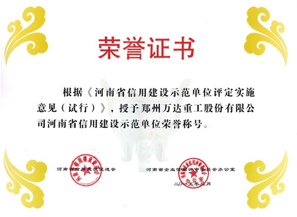 熱烈祝賀鄭州萬達(dá)重工股份有限公司通過了“河南省信用建設(shè)促進(jìn)會”和“河南省企業(yè)信用評審委員會辦公室”共同組織的“河南省信用建設(shè)示范單位”復(fù)審認(rèn)證,被認(rèn)定為“河南省信用建設(shè)示范單位”榮譽(yù)稱號!