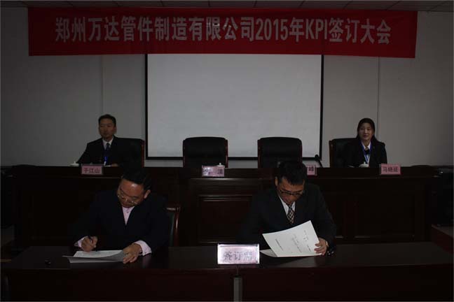 鄭州萬達(dá)管件制造有限公司2015年KPI簽訂會于1月30號在公司行政區(qū)會議室隆重舉行,公司班長以上所有管理人員參加了此次簽訂會議。簽訂會分為三級簽訂,即:董事長與總經(jīng)理簽訂、總經(jīng)理與公司各高管簽訂、公司各高管與分管的各部門負(fù)責(zé)人簽訂,近期,各部門負(fù)責(zé)人將部門的KPI指標(biāo)進(jìn)行分解,與各班組及相關(guān)崗位簽訂目標(biāo)責(zé)任書,達(dá)到“千斤重?fù)?dān)人人挑,人人肩上有指標(biāo)”的責(zé)任分解領(lǐng)受,確保最終順利完成公司2015年度各項(xiàng)任務(wù)和目標(biāo)。