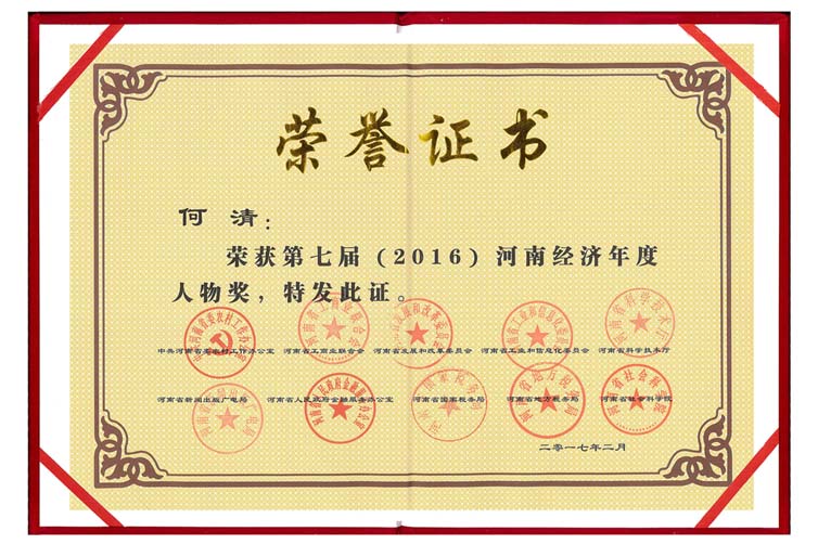 熱烈慶祝公司董事長書記何清先生榮獲 第七屆(2016)"河南經(jīng)濟(jì)年度人物"