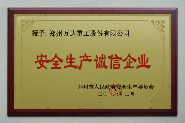 經(jīng)過鄭州市政府安委辦會同相關(guān)縣(市、區(qū))對照《鄭州市安全生產(chǎn)誠信企業(yè)評選標(biāo)準(zhǔn)及細(xì)則》進(jìn)行了嚴(yán)格考評和驗收。鄭州市人民政府安全生產(chǎn)委員會辦公室《鄭安委辦〔2017〕7號》文件決定授予鄭州萬達(dá)重工股份有限公司為“2016年度鄭州市安全生產(chǎn)誠信企業(yè)”榮譽(yù)稱號。