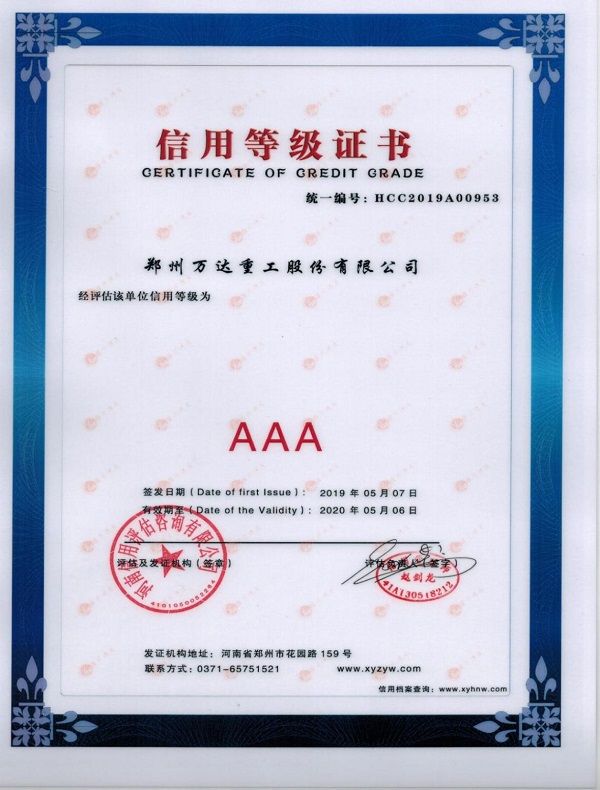 我國企業(yè)信用評估的信用等級采用國際通行的"四等十級制"評級等級,具體等級分為:AAA,AA,A,BBB,BB,B,CCC,CC,C,D。同時也是衡量企業(yè)財務(wù)能力的重要指標體系。(AAA信用等級意味著信用極好,企業(yè)的信用程度高、債務(wù)風(fēng)險小。該類企業(yè)具有優(yōu)秀的信用記錄,經(jīng)營狀況佳,盈利能力強,發(fā)展前景廣闊,不確定性因素對其經(jīng)營與發(fā)展的影響極?。?。主體信用評級是一個企業(yè)整體實力、抗風(fēng)險能力、治理能力及綜合競爭力的集中體現(xiàn)。河南信用評估咨詢有限公司在信用評級報告中肯定了鄭州萬達重工股份有限公司在較好的業(yè)務(wù)成長性、凈資產(chǎn)不斷增長、資本結(jié)構(gòu)穩(wěn)健等方面的優(yōu)勢,綜合評定鄭州萬達重工股份有限公司信用等級為AAA級,本級反映了鄭州萬達重工股份有限公司信用管理基礎(chǔ)完善,信用能力強,誠信度高,發(fā)展趨勢樂觀,綜合能力處于行業(yè)領(lǐng)先水平。