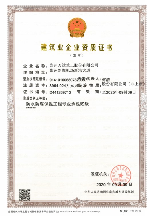 熱烈祝賀鄭州萬達(dá)重工股份有限公司順利通過了由鄭州市城鄉(xiāng)建設(shè)委員會(huì)航空港實(shí)驗(yàn)區(qū)批復(fù)的《防水防腐保溫工程專業(yè)承包貳級(jí)資質(zhì)》,證書編號(hào):D441269713,有效期:2020年09月09日至2025年09月09日。