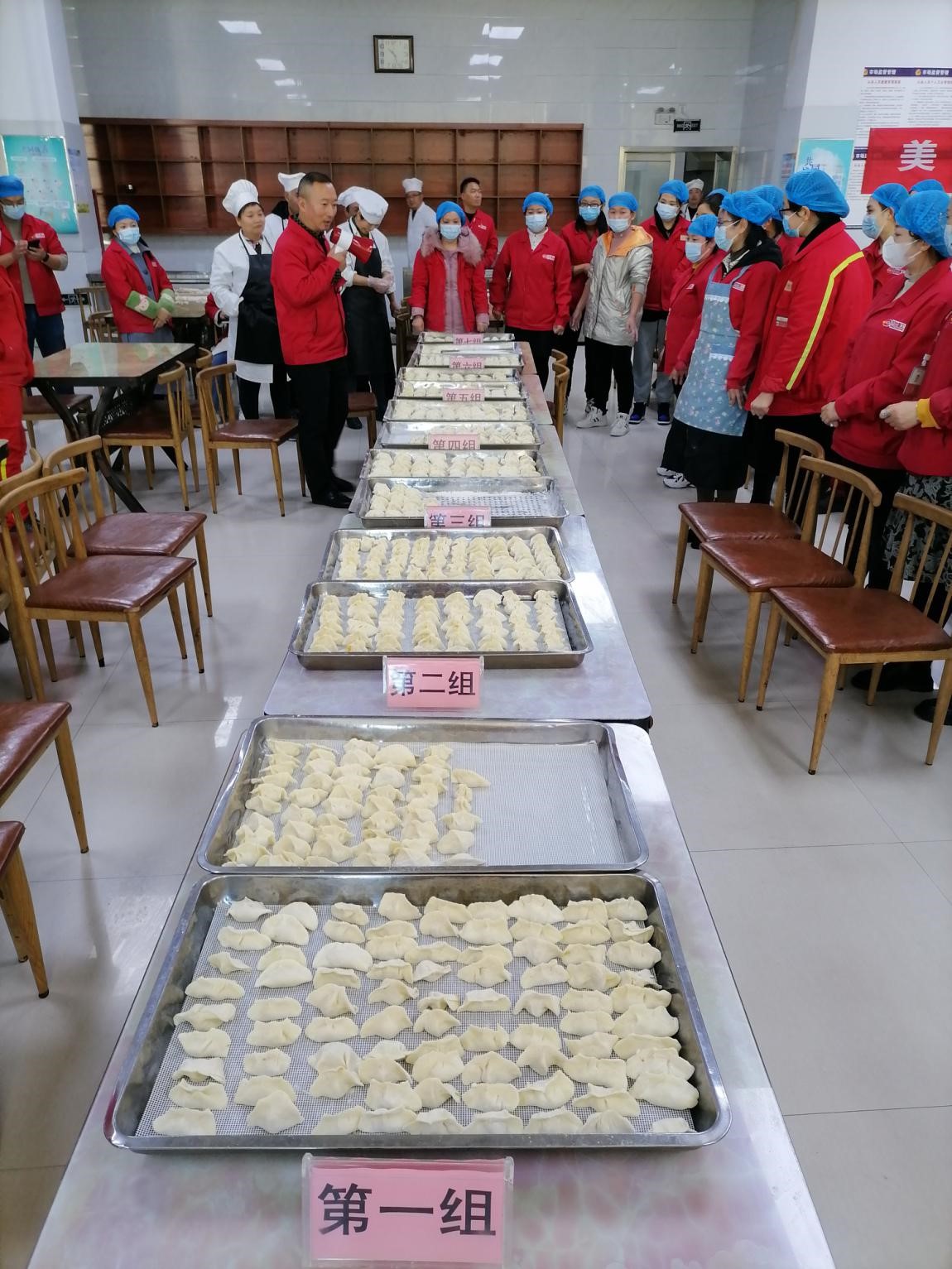 包餃子比賽分為小組賽和團體賽。比賽中,各組分工明確,揉面、揪團、搟皮、包餡,參賽員工們動作嫻熟,熱情高漲,餃子皮在手里一折一捏,很快籠篦上擺放整齊的白白胖胖的餃子“誕生”了,有精致小巧的柳葉餃,有形如元寶的元寶餃,還有小籠包似的大肚餃,餃子形狀各異,煞是好看。最后,依據(jù)每組包餃子的快慢、餡量是否適中,外形是否漂亮、美觀、餃子的數(shù)量多少等作為打分依據(jù),經(jīng)過激烈的較量和評委評議,最終,評選出了小組賽一二三等獎各一組和團體賽優(yōu)勝隊。