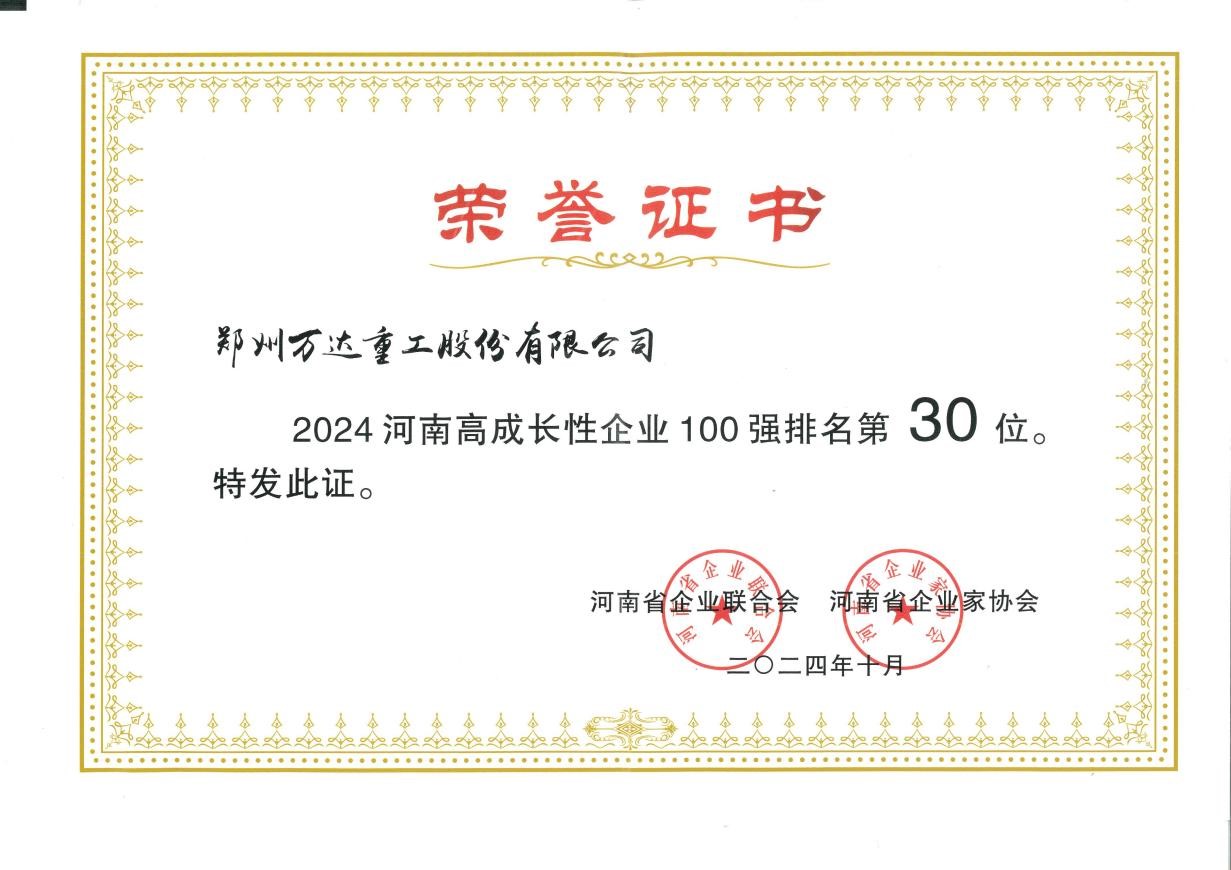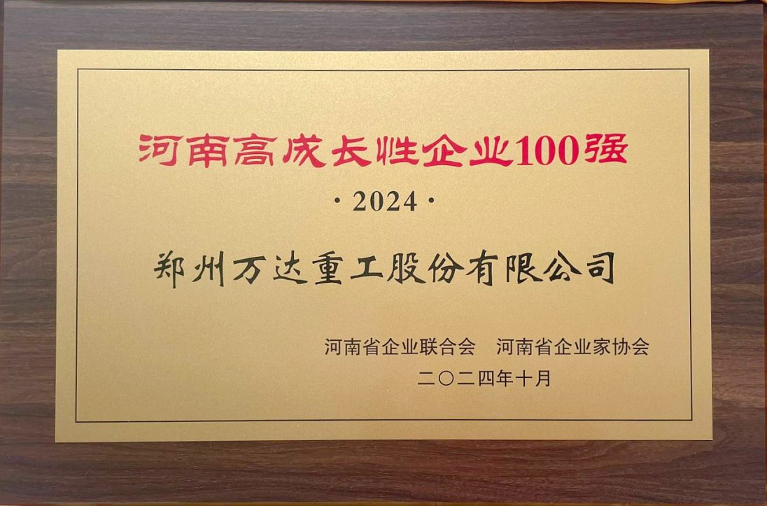 熱烈祝賀鄭州萬達重工股份有限公司榮獲“2024河南省高成長性100強企業(yè)”