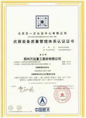 熱烈祝賀鄭州萬達重工股份有限公司獲得《武器裝備質(zhì)量管理體系認證證書》